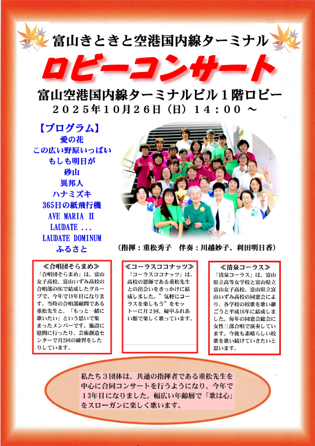 イベント 2025.10.06 ロビーコンサート開催のご案内 合唱団そらまめ、コーラスココナッツ、清泉コーラスによるロビーコンサートが開催されます。 3グループの女声合唱をお楽しみください。 ・日時 2025年10月26日(日)14:00~ ・会場 富山きときと空港国内線1階ロビー
