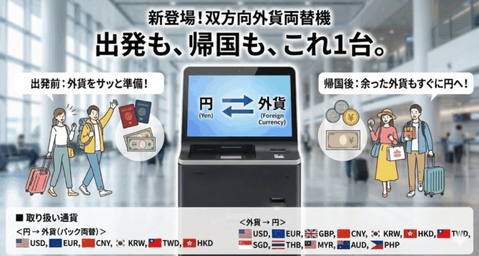 新型両替機は、2025年12月25日より運用開始を予定しており、年末年始の海外旅行や冬休みのご予定など、渡航需要が高まる時期にあわせて便利にご利用いただけますので、ぜひこの機会にご活用ください。